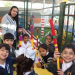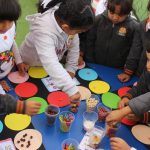 The students participated in seven stations: Hopscotch, Build Ice-cream, write 100 Words, connecting 100 cubes, Counting sticks, 100 different shapes, 100 Days Web