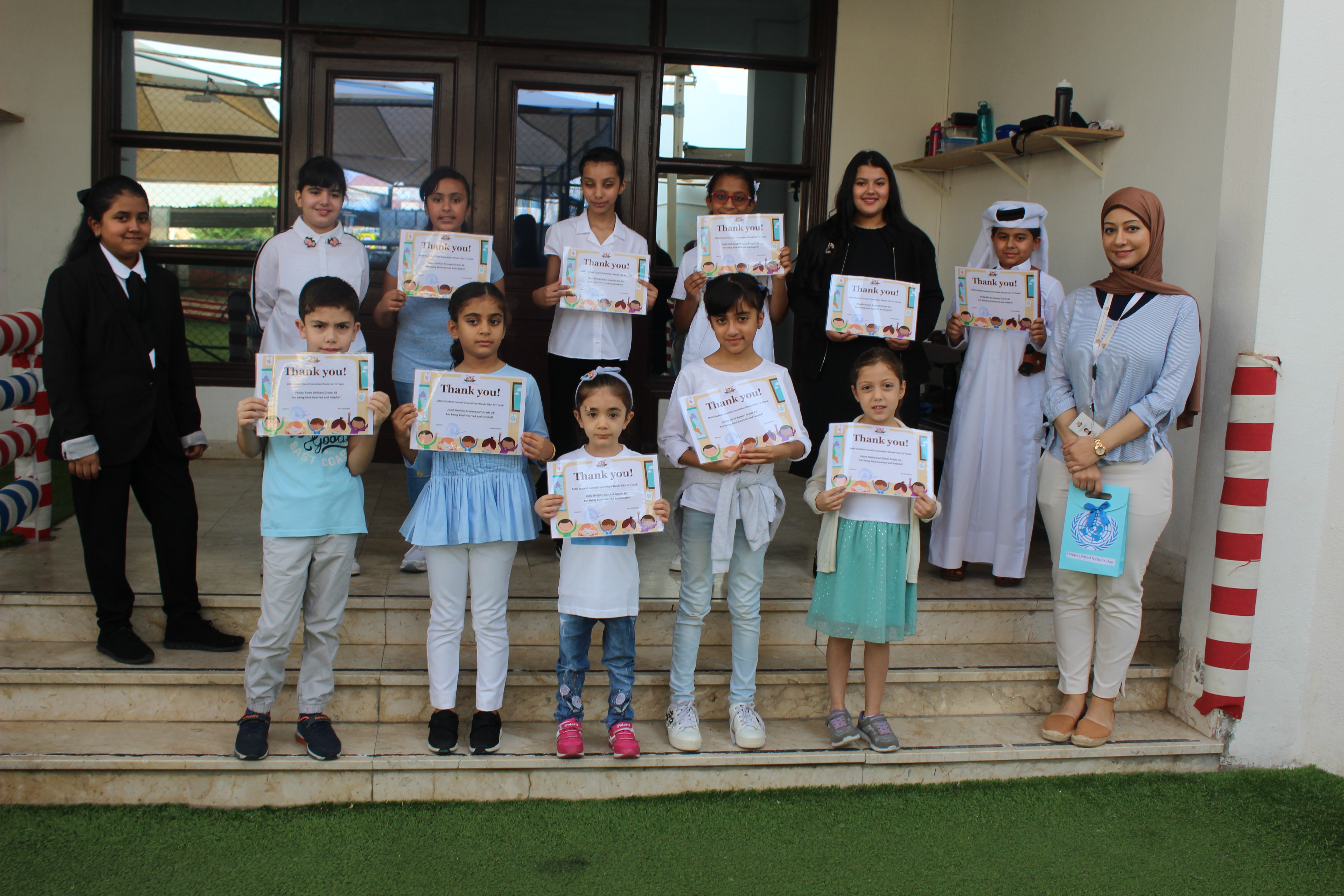 Students came to school wearing white and light blue colors. They also did different posters discussing the sustainable development goals of the UN assigned to their grade level and also attended a workshop by Mrs.Eman Al Kaabi a volunteer from Qatar Charity about the importance of humanitarian acts.